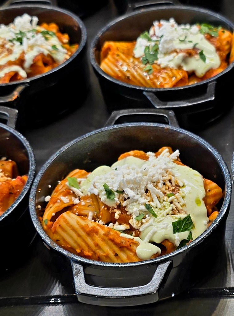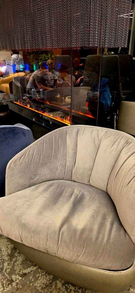 We were immediately greeted with complimentary champagne and directed to the large, cozy seating area. In the back of the lounge was a fairly extensive buffet of food and a well-stocked bar. Seeing as how we had almost a 5-hour layover these perks did NOT go unappreciated!! After sampling several of the food and beverage options and relaxing, it was time to head to the gate.