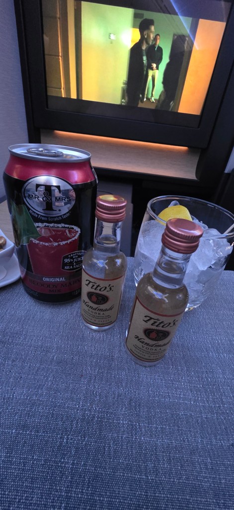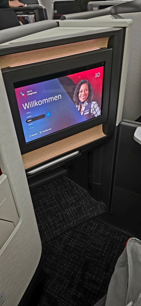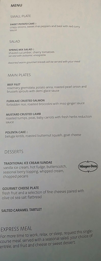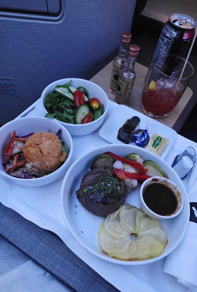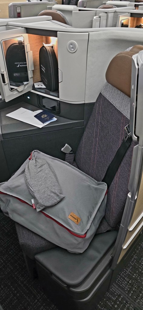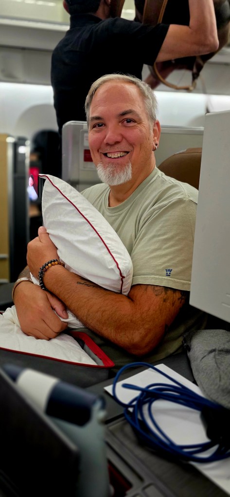 We had done our research on the “pods” that you are seated in when you fly business class, ( they call them suites), but looking at pictures and reading reviews online did NOT do it justice. A lay-flat seat, pillow, blanket, slippers, BOSCH headphones, TV remote, eye mask, slippers, earplugs, toothbrush and toothpaste, lotion, and wipes, all neatly packaged and waiting for us in our suites! It was overwhelming. DEFINITELY a case of “you get what you pay for!” And then there was the food choices for a late dinner if you wanted. I had the filet and Jeff had the salmon. Very good quality!!!