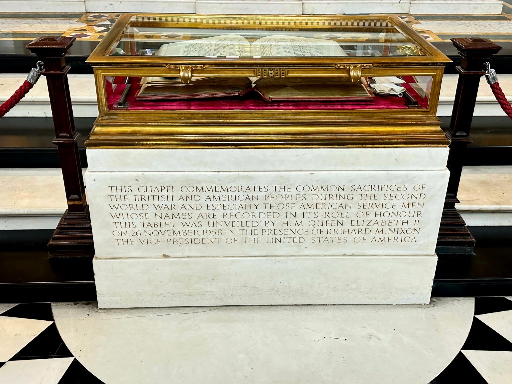 I won’t lie and say the climb was easy, but in the end the views from the top were indeed spectacular. The cathedral was built to very specific specifications, one being that the distance from the base of the dome to the floor of the cathedral had to be exactly 365 feet, to represent each day of the year. Once we made the trip back down the 500 steps, we visited the American chapel, built in honor of the Americans who died fighting alongside the British in WWII. We then headed down to the basement level, or crypt. This is were approximately 300 famous Londoners are buried. This level had magnificent artwork and sculptures as well.