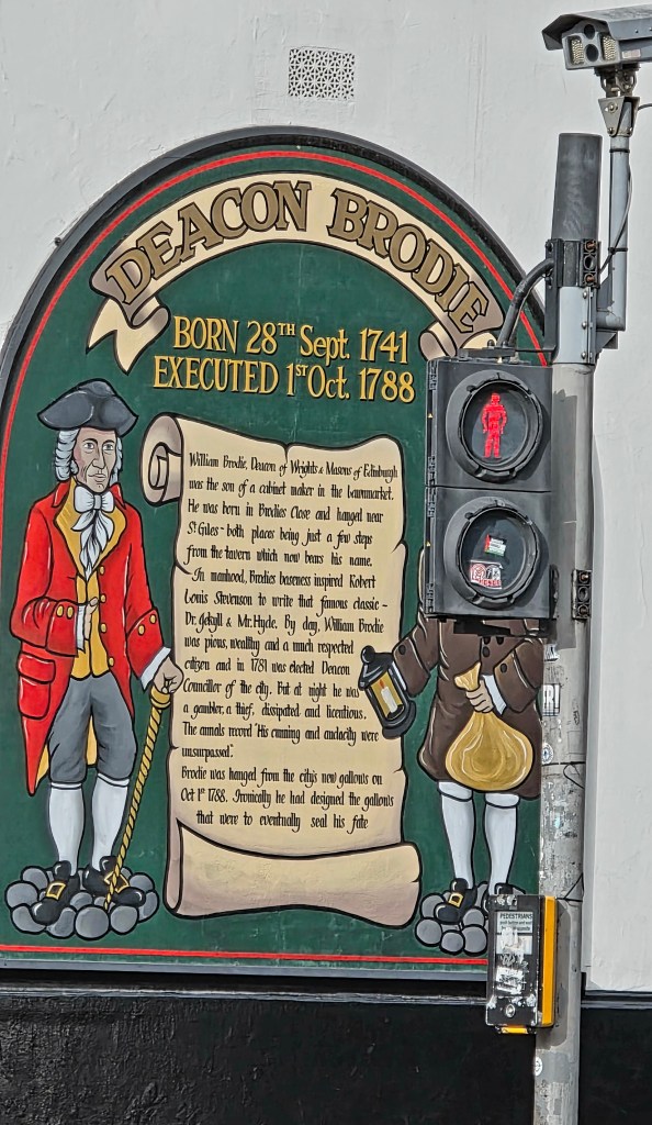 A less ghastly story we heard was about the man from Edinburgh who inspired the story of Dr. Jekell and Mr. Hyde. His Name was Deacon Brodie. He was a respected pillar of the city by day, (thus becoming a Deacon), but was then a violent theif at night. Once his true nature was discovered, he was hung in the gallows on October 1st, 1788. It was said that this story did inspire Robert Stevenson to write his famous book!