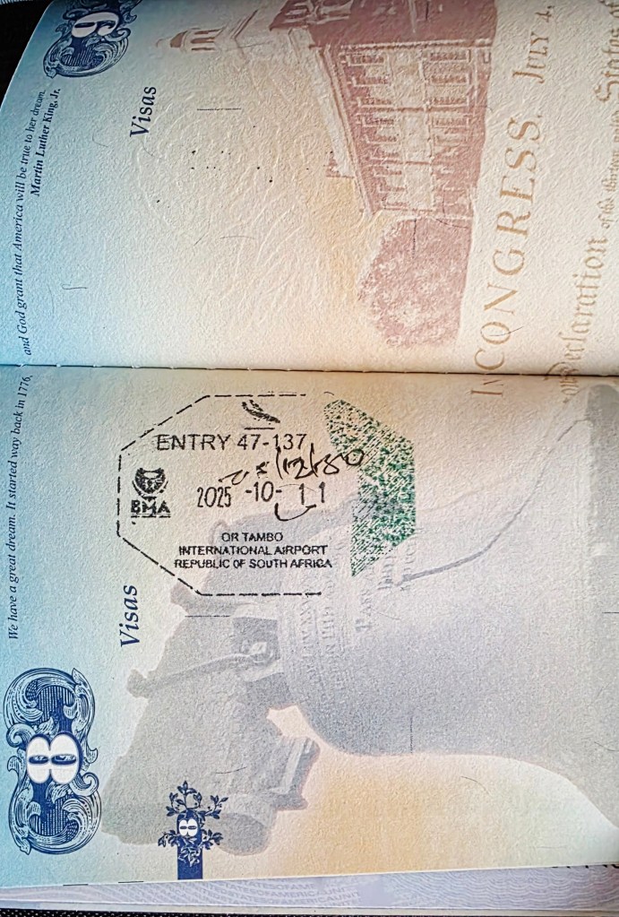 Much like Day 5, Day 6 was a travel day. We deplaned in Johannesburg, where the passport control area was not electronic as it is in London. Here you actually take your passport to the control officer who asks you how long you’re staying, and gives you an actual stamp! Because we were connecting with a domestic flight next, we had to then re-check our bags on the next airline. This must be a very normal and frequent occurrence, as there was very good signage that directed us to the recheck area.