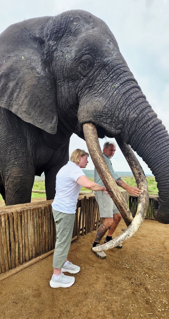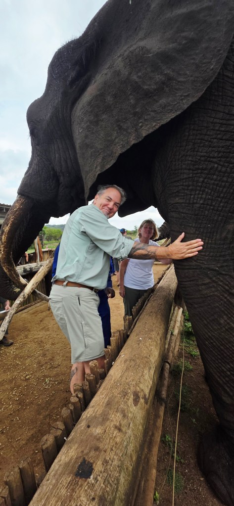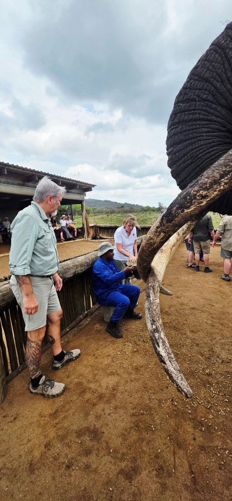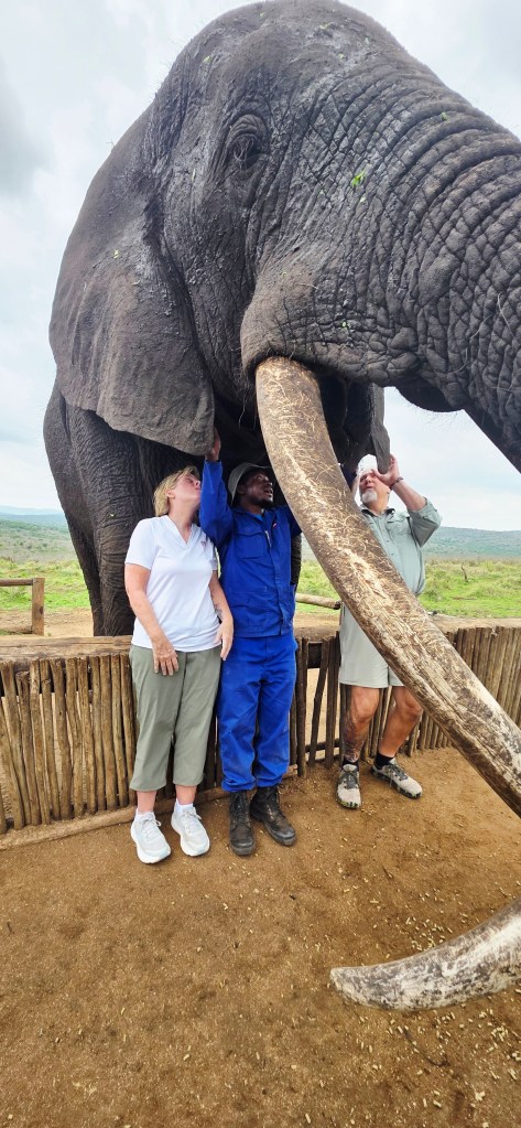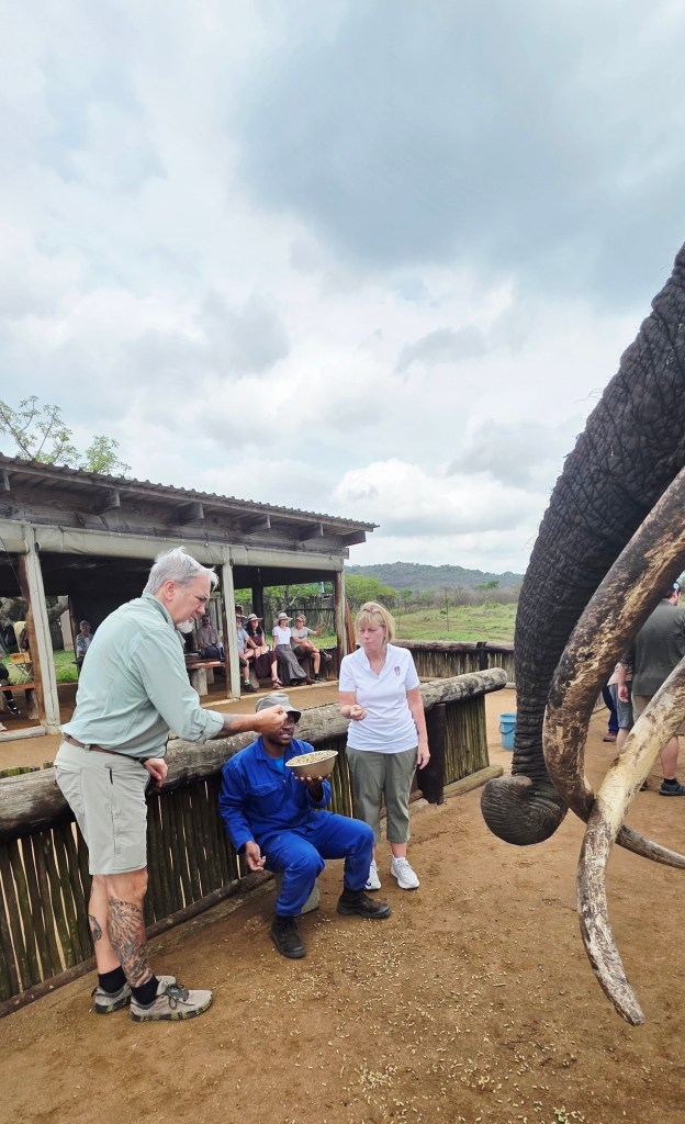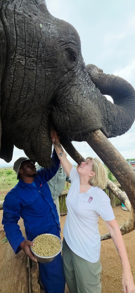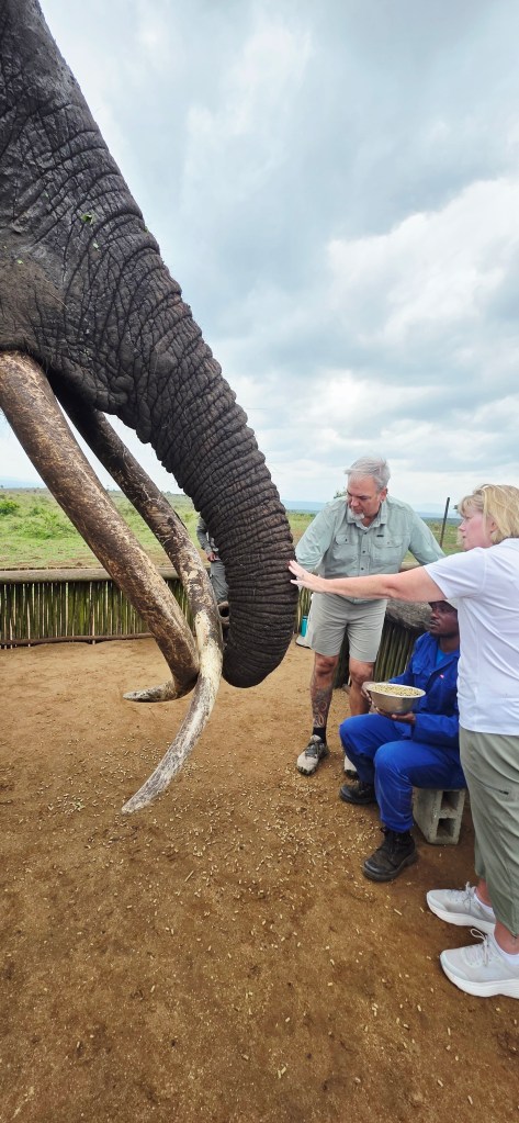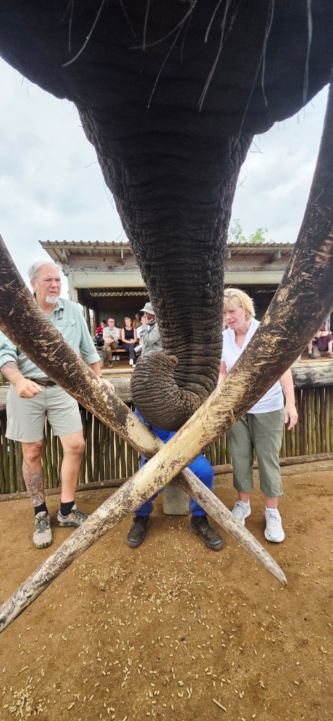 Later in the morning we reconvened to go off-site to a small elephant interaction station at a different reserve about 30 minutes away. This reserve only has 2 elephants in it that are not enclosed at all during the day, but do stay in a Boma (enclosure) at night for their safety. During the day they have 2 “handlers” whose job is strictly to walk around the reserve with them from 7 a.m. to 7 p.m. As the reserve is like 20,000 acres, those handlers can walk up to 40 miles a day!! He said the elephants see the handlers as one of them, and last week one of the elephants protected one of the handlers from a lioness attack!!