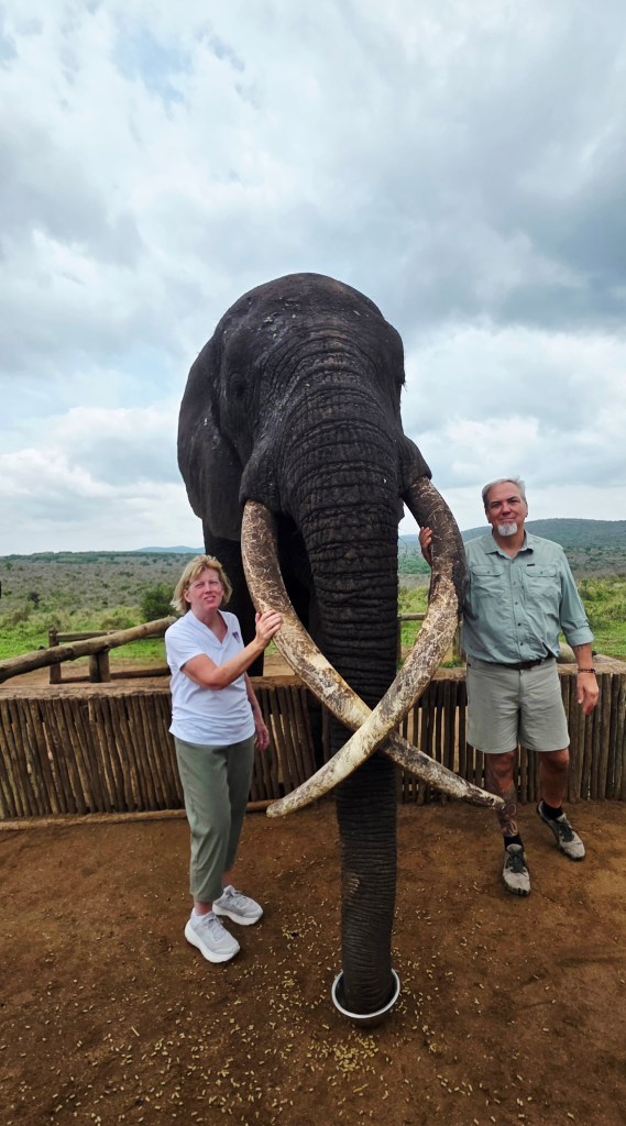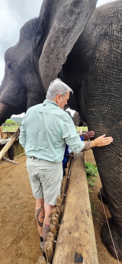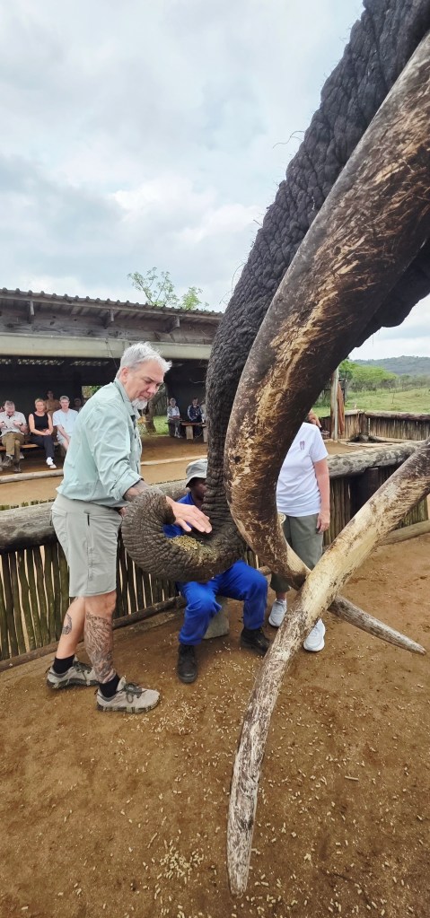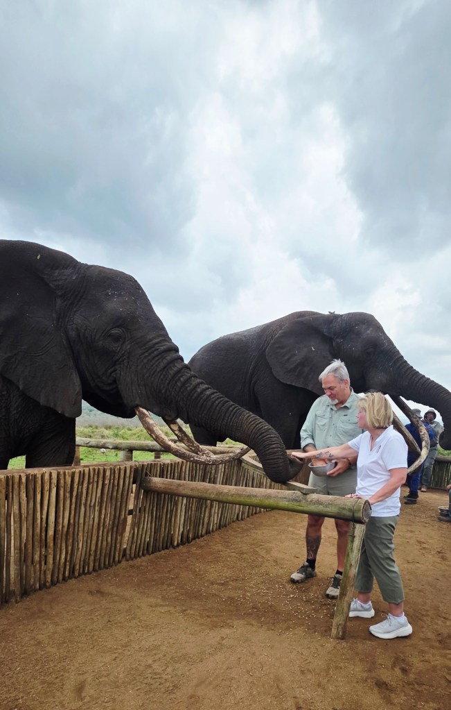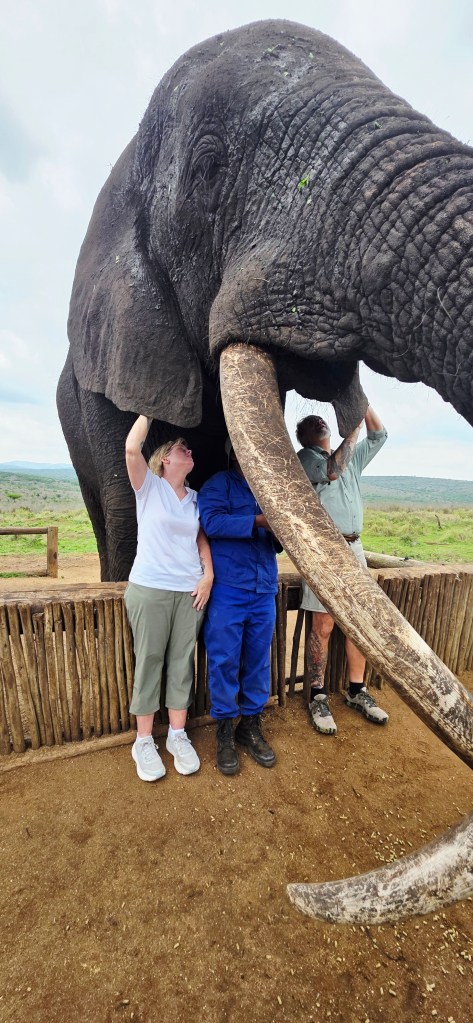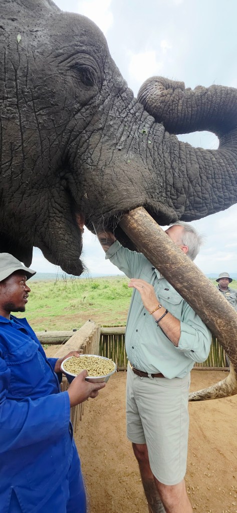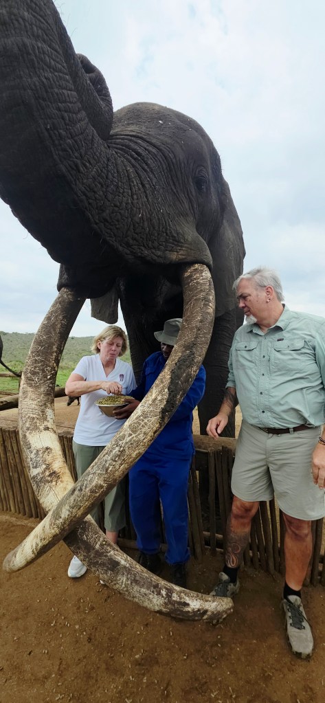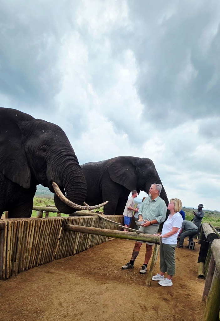 Later in the morning we reconvened to go off-site to a small elephant interaction station at a different reserve about 30 minutes away. This reserve only has 2 elephants in it that are not enclosed at all during the day, but do stay in a Boma (enclosure) at night for their safety. During the day they have 2 “handlers” whose job is strictly to walk around the reserve with them from 7 a.m. to 7 p.m. As the reserve is like 20,000 acres, those handlers can walk up to 40 miles a day!! He said the elephants see the handlers as one of them, and last week one of the elephants protected one of the handlers from a lioness attack!!