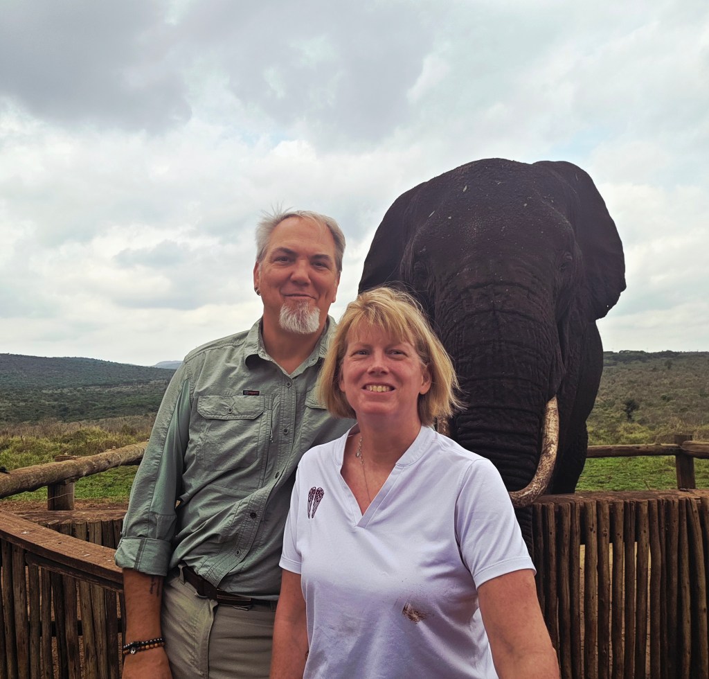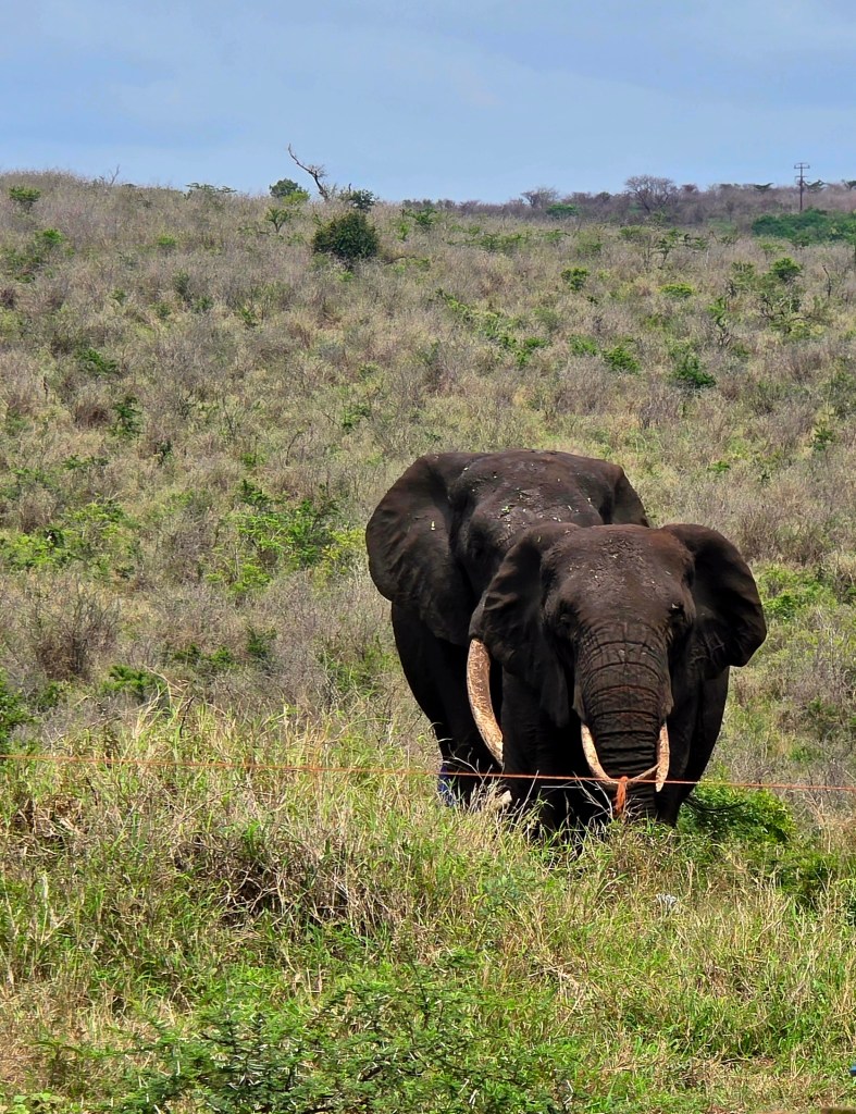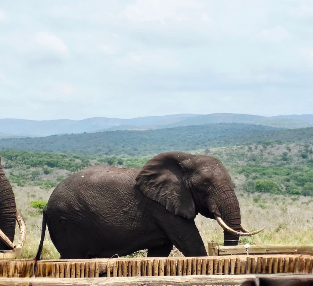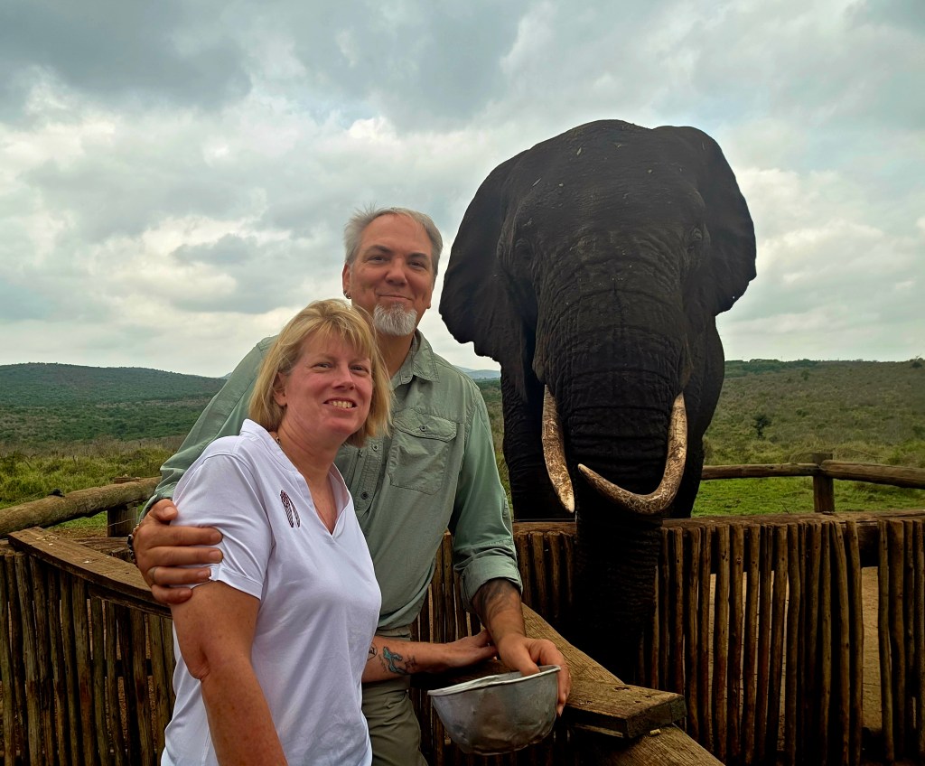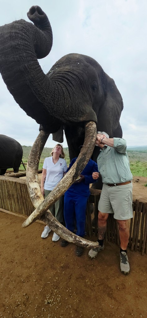 Later in the morning we reconvened to go off-site to a small elephant interaction station at a different reserve about 30 minutes away. This reserve only has 2 elephants in it that are not enclosed at all during the day, but do stay in a Boma (enclosure) at night for their safety. During the day they have 2 “handlers” whose job is strictly to walk around the reserve with them from 7 a.m. to 7 p.m. As the reserve is like 20,000 acres, those handlers can walk up to 40 miles a day!! He said the elephants see the handlers as one of them, and last week one of the elephants protected one of the handlers from a lioness attack!!